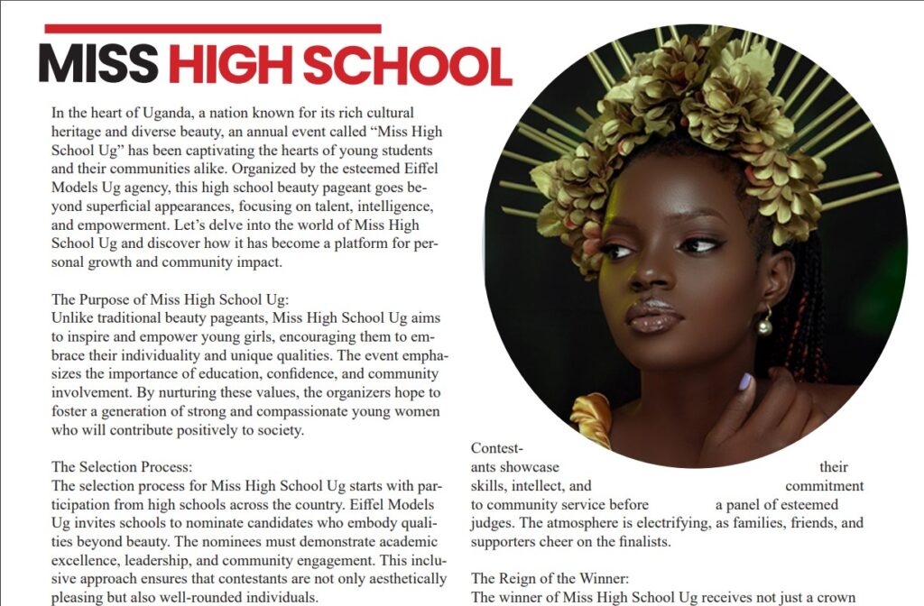Organized by Eiffel Models Ug agency, this high school beauty pageant goes beyond superficial appearances, focusing on talent, intelligence, and empowerment. Let’s delve into the world of Miss High School Ug and help you find out the details of this upcoming event.