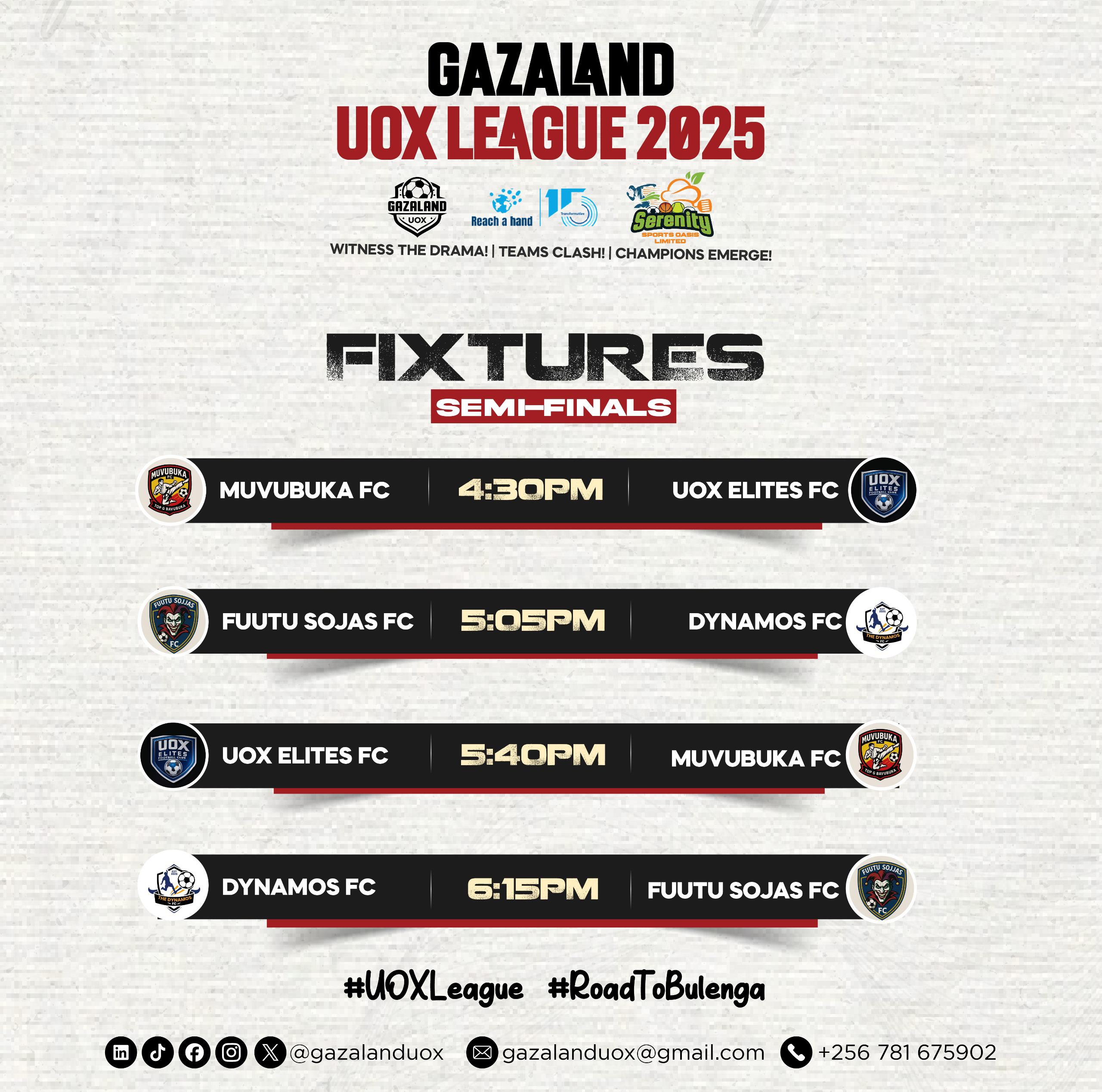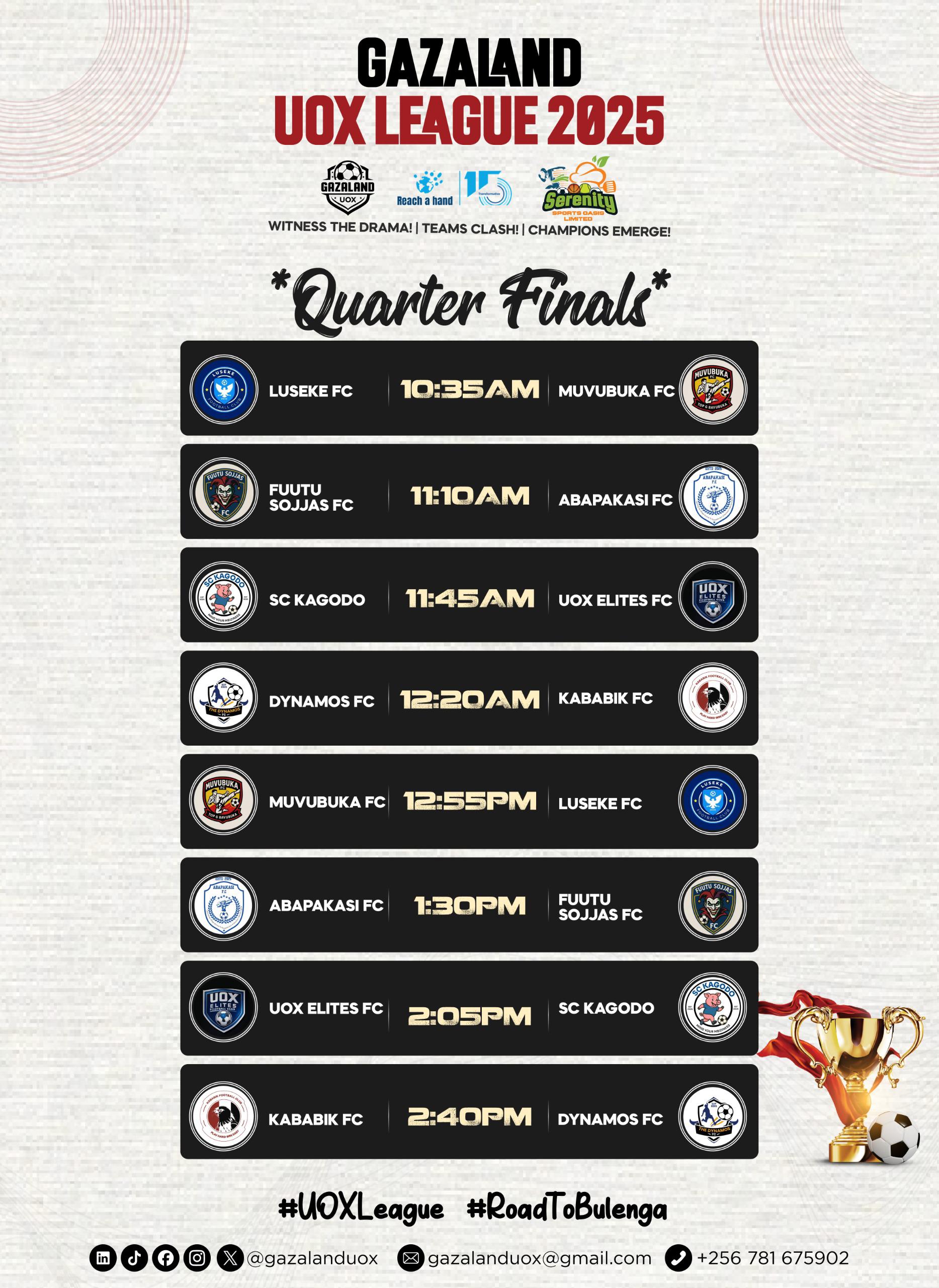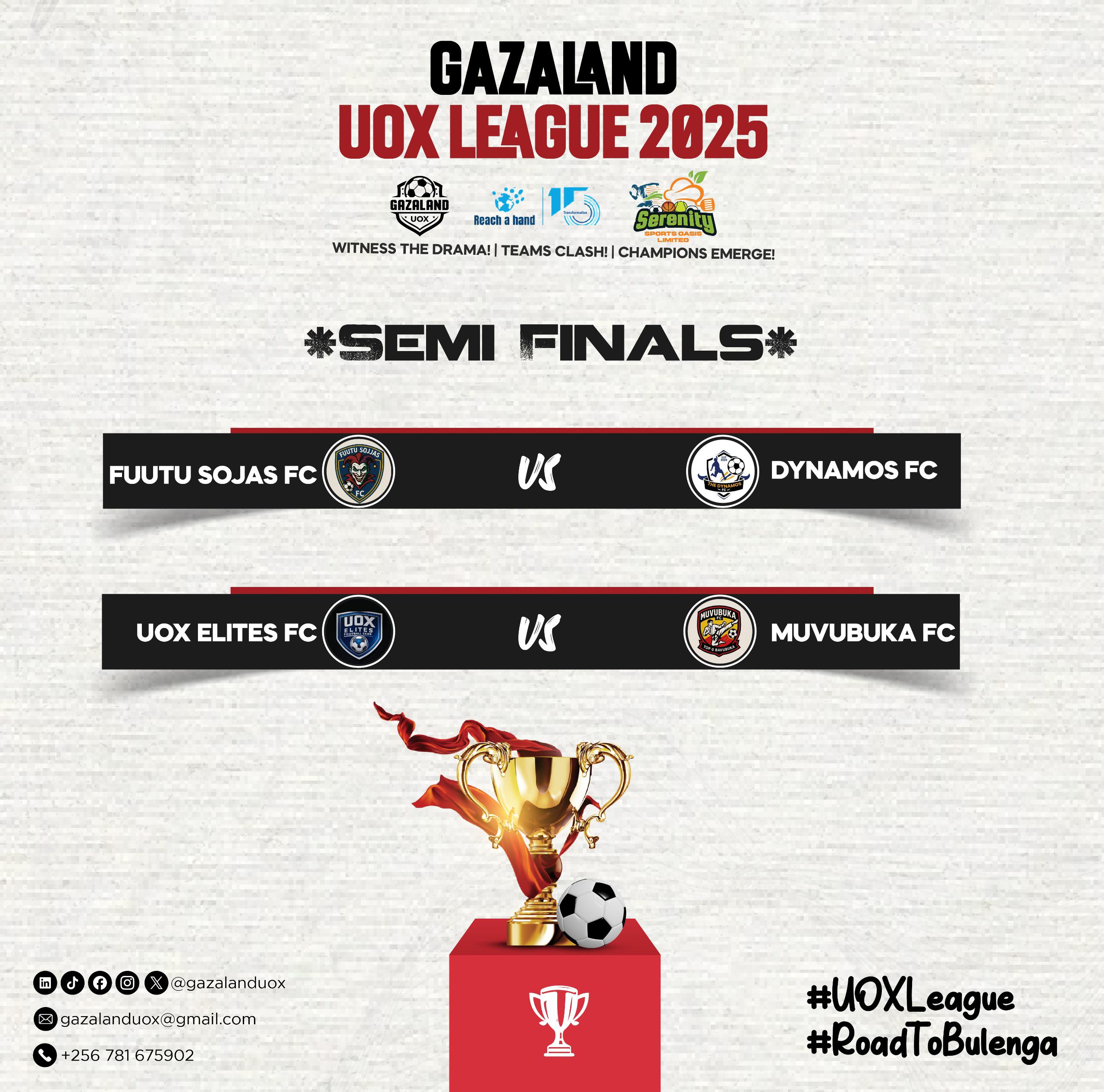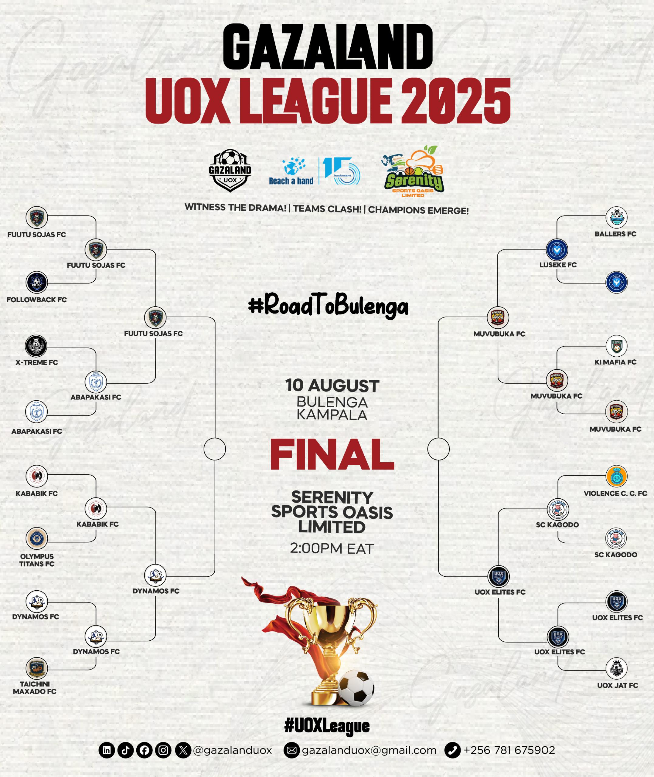 As of 08:15 AM EAT on Monday, July 28, 2025, the Gazaland UOX League 2025 is building excitement for its grand finals on August 10, 2025, at Serenity Sports Oasis in Bulenga, Kampala. With the quarter-finals and semi-finals concluded, the focus shifts to the upcoming finals and a special losers’ match to kick off the day. Here’s a detailed breakdown of the participants and the corrected lineup.