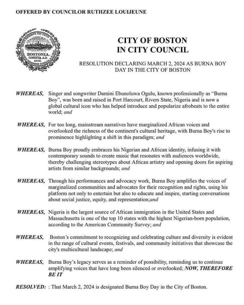 In a remarkable celebration of African culture and music, the City of Boston has officially declared March 2, 2024, as Burna Boy Day. The city council, led by Councilor Ruthzee Louijeune, passed a resolution to honor the global music icon for his contributions to afrobeats and his role in amplifying African voices on the world stage.