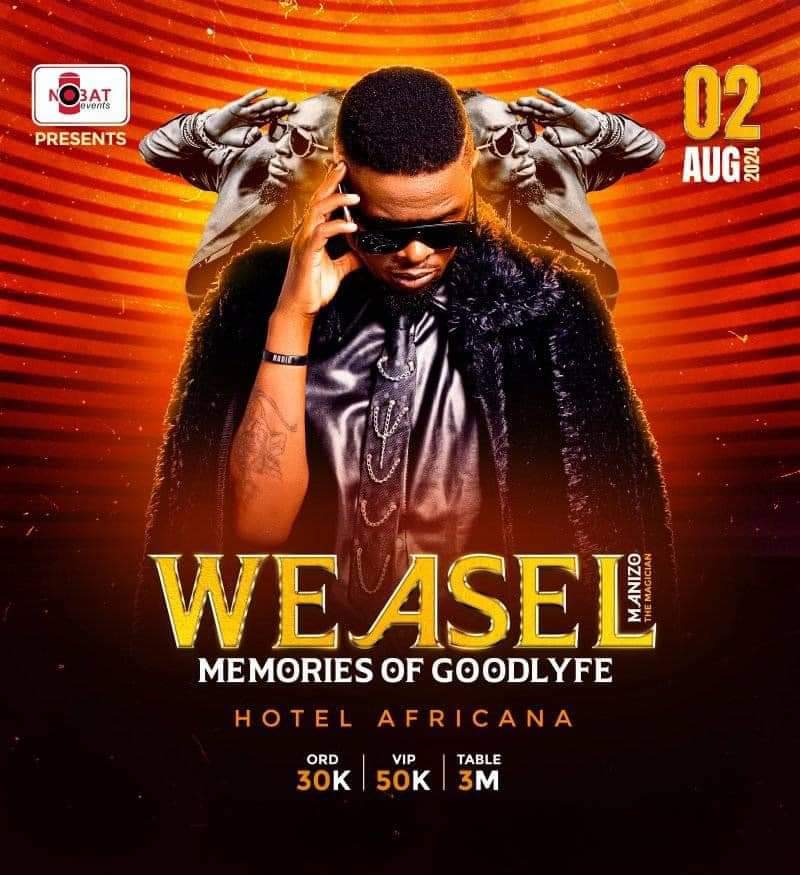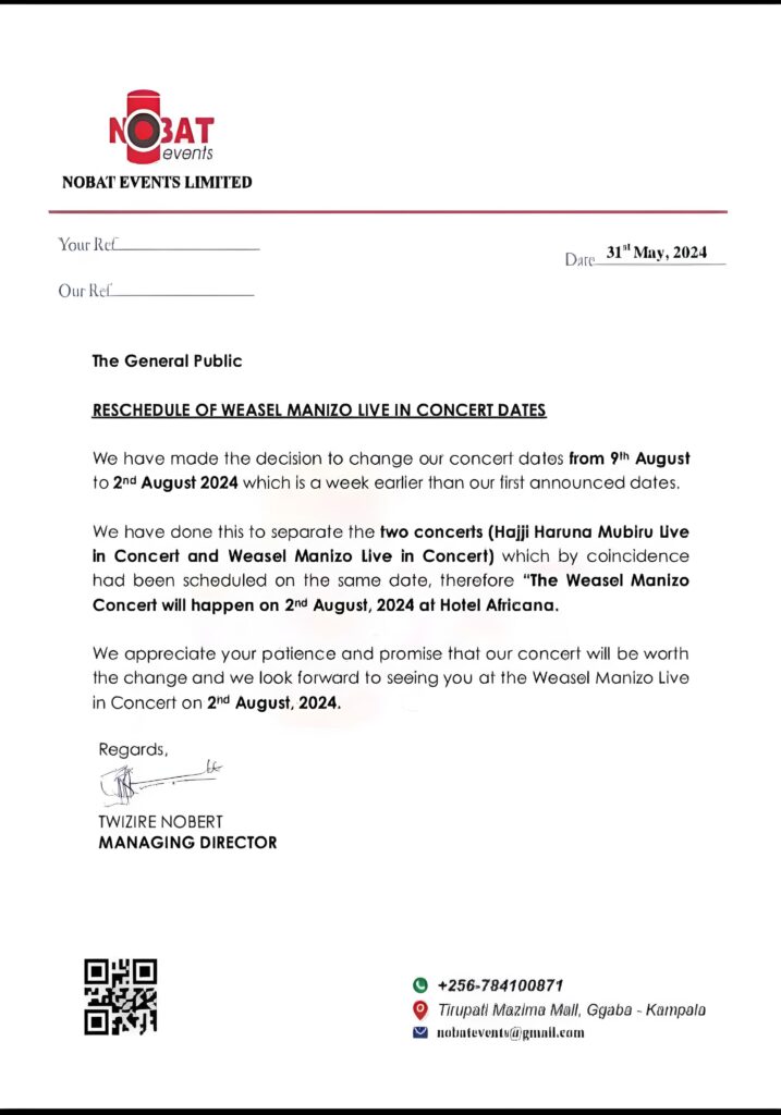 We have made the decision to change our concert dates from 9th August to 2nd August 2024 which is a week earlier than our first announced dates.We have done this to separate the two concerts (Hajji Haruna Mubiru Live in Concert and Weasel Manizo Live in Concert) which by coincidence had been scheduled on the same date, therefore “The Weasel Manizo Concert will happen on 2nd August, 2024 at Hotel Africana.We appreciate your patience and promise that our concert will be worth the change and we look forward to seeing you at the Weasel Manizo Live in Concert on 2nd August, 2024”.