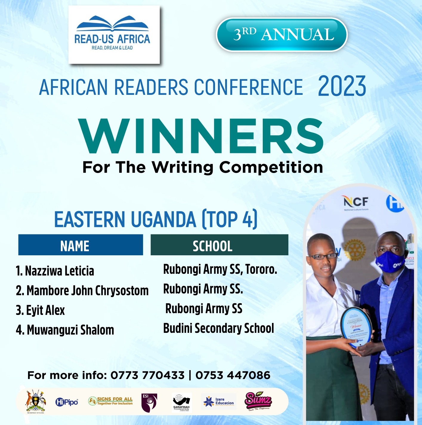The winners were announced on the promised day by the event organizers, Read Us Africa, and their partners. The winners were meticulously selected from each region of Uganda based on the schools that had participated in the competition.