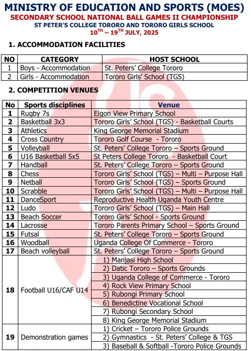 Tororo Girls School – Hosts netball, basketball (3×3), chess, scrabble, and ludo.