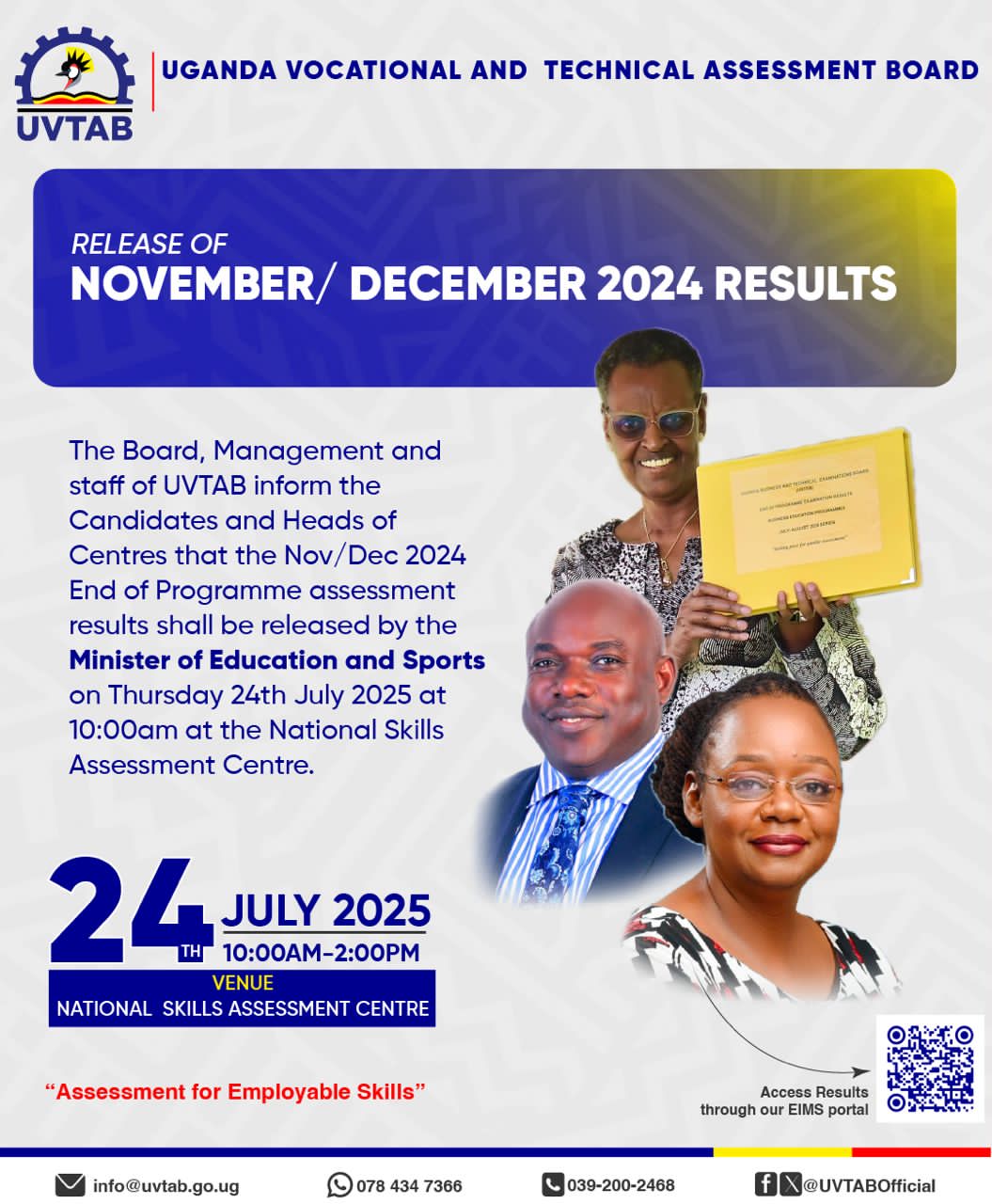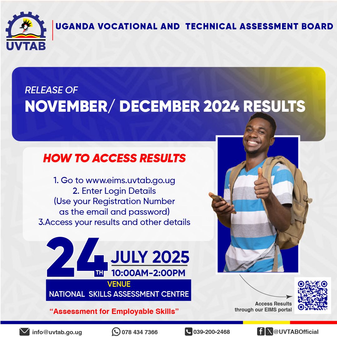 For added convenience, results can also be accessed on Thursday, July 24, 2025, between 10:00 AM and 2:00 PM at the National Skills Assessment Centre. Alternatively, scan the provided QR code to access results directly through the EIMS portal. For further assistance, contact UVTAB at info@uvtab.go.ug, call 078 434 7366, or reach out at 039-200-2468.